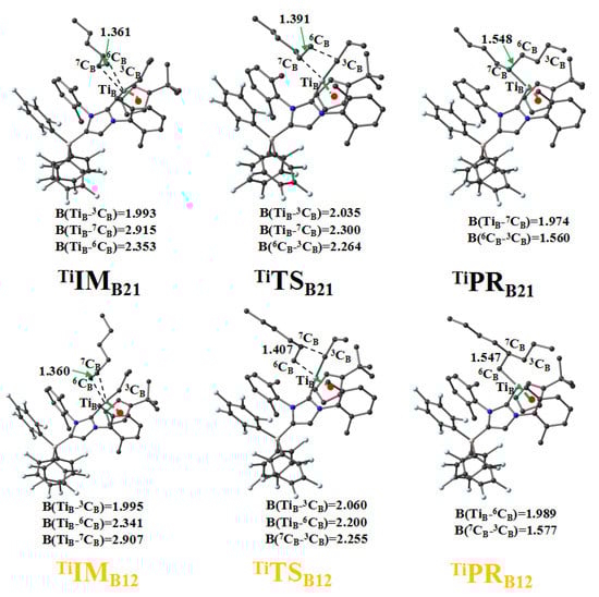 Following ethylene insertion into the TiH or TiB catalysts, the 1-hexene insertion reaction can be accomplished through 1,2 insertion or 2,1 insertion reactions. The 1-hexene 1,2 insertion and 2,1 insertion into the TiH or TiB catalysts involve an intermediate, followed by a four-member ring transition state, which yields the final product. Figure 3 illustrates the reaction pathways of 1-hexene insertion into Ti catalysts, namely TiH21 (blue), TiH12 (green), TiB21 (black), and TiB12 (yellow). Figure 4 shows the optimized structures of the 1-hexene insertion into Ti catalysts. The WBIs and QNBO involved in 1-hexene insertion into the TiH and TiB catalysts are presented in Table 3.