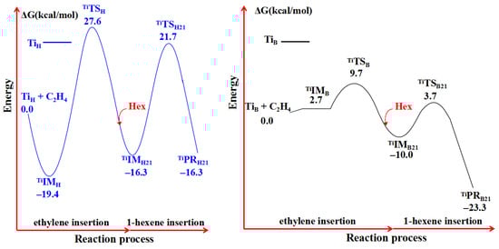 The comparison of the entire ethylene and 1-hexene insertion reaction process for TiH and TiB catalysts is shown in Figure 5. In the ethylene and 1-hexene insertion into TiH catalysts, the energy of the transition state TiTSH was the highest at 27.6 kcal/mol, whereas that of the final product TiPRH21 was −16.3 kcal/mol. However, the energy of the intermediate TiIMH was −19.4 kcal/mol, lower than that of the final product TiPRH21 (−16.3 kcal/mol), thus indicating that the intermediate is highly stable. Therefore, the reaction was prone to halt at the intermediate rather than proceed to yield the product. Conversely, for the entire ethylene and 1-hexene insertion into TiB catalysts, compared with the reactant, the energy of the transition state TiTSB was 9.7 kcal/mol, considerably lower than that of TiTSH (27.6 kcal/mol). The energy of the final product TiPRB21 was −23.3 kcal/mol, significantly lower than that of TiPRH21 (−16.3 kcal/mol). Consequently, the entire ethylene and 1-hexene insertion reaction proceeded smoothly to reach the final product for the TiB catalyst.