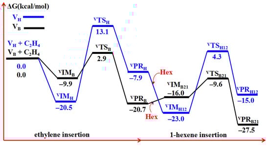 Reaction pathways for ethylene and 1-hexene insertion into VH (blue) or VB (black) catalysts. Depending on which carbon (6C or 7C) in 1-hexene forms a C–C bond with 3C carbon of [V]–alkyl, there are two insertion modes for 1-hexene insertion: the 1,2-insertion forming V–6C and 7C–3C bonds and the 2,1-insertion forming V–7C and 6C–3C bonds.