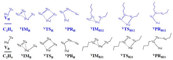 Further comparison between TiB and VB catalysts revealed that the energy of transition state VTSB of the ethylene and 1-hexene insertion into VB catalysts was 2.9 kcal/mol, which is lower than that of TiTSB (9.7 kcal/mol). Additionally, the energy of the final product VPRB21 was −27.5 kcal/mol, which is lower than that of TiPRB21 (−23.3 kcal/mol). These results indicate that the VB catalyst has higher reaction activity than the TiB catalyst, which is in agreement with the experimental results. Further, the catalytic activity reached 4590 kg-PE/mol-Ti·h and 11,000 kg-PE/mol-V·h for ethylene polymerization [,].