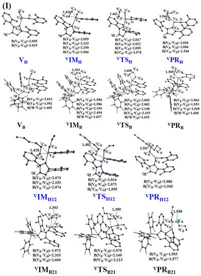 The energy results indicate that the VB21 pathway is preferred over the VH12 pathway. As shown in Figure 6, the energy of the transition state VTSB21 was lower than that of VTSH12 by 13.9 kcal/mol. Moreover, the energy of product VPRB21 was lower than that of VPRH12 by 12.5 kcal/mol. Furthermore, the energy of VIMH12 was lower than that of the corresponding product VPRH12 by 8.0 kcal/mol, thus indicating its high stability. Therefore, the reaction was prone to halt at the intermediate rather than proceed to yield the product. However, the energy of intermediate VIMB21 was higher than that of the product VPRB21 by 11.5 kcal/mol. The WBIs of VB–6CB (0.136) and VB–7CB (0.257) in VIMB21 were significantly lower than those in VIMH12 (0.660 and 0.601). Thus, the reaction proceeded smoothly to yield the product for VB 1-hexene insertion.