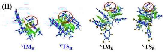 The EIM−dist and ETS−dist(eff) values of VIMH and VTSH were 15.4 and 72.7 kcal/mol, respectively, higher than those of VIMB (5.4 kcal/mol) and VTSB (48.5 kcal/mol), respectively. This indicates that VIMH and VTSH underwent a more significant configuration change compared with the reactants, which is consistent with the IRI analysis. Figure 7II shows the IRI analysis of VIMH, VTSH, VIMB, and VTSB []. The interactions between the two reaction fragments (C2H4 and V catalyst) in VIMH and VTSH were stronger than those in VIMB and VTSB.