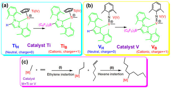 Schematic of the structure diagram of titanium (or vanadium) catalysts and the reaction pathway of ethylene/1-hexene copolymerization. (a) Structural diagram of titanium catalysts (TiH and TiB). (b) Structural diagram of vanadium catalysts (VH and VB). (c) Reaction pathway of ethylene (I) and 1-hexene (II) copolymerization.