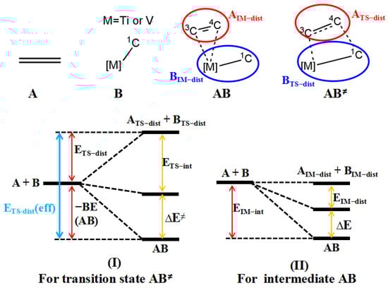 Bickelhaupt’s activation strain analysis is frequently employed to gain insight into the origin of the various contributions [,,]. This analysis decomposes the electronic activation energy ΔE≠ of the transition state into the distortion energy (ETS−dist) and interaction energy (ETS−int) between two reaction fragments (A: C2H4 and B: Ti catalyst). Herein, this method was applied to analyze two transition states (TiTSH and TiTSB). As shown in Scheme 2I, the distortion energies were calculated as ETS-dist(A) = ETS−A − EA and ETS−dist(B) = ETS−B − EB, where EA (or EB) and ETS−A (or ETS−B) are the energies of A (or B) in reactant ground state and transition state geometries, respectively. The interaction energies between A and B in the transition state were calculated by ETS−int = ΔE≠ − ETS−dist + BE(AB), where ETS−dist = ETS−dist(A) + ETS−dist(B), BE(AB) is the binding energy between A and B in the intermediate complex AB, and ΔE≠ is the electronic activation energy for ethylene insertion reaction. When considering the intermediate complex AB as the reference, the electronic activation energy ΔE≠ = ETS−dist(eff) + ETS−int, so ETS−dist(eff)= ETS−dist − BE(AB) represent the effective distortion energy.