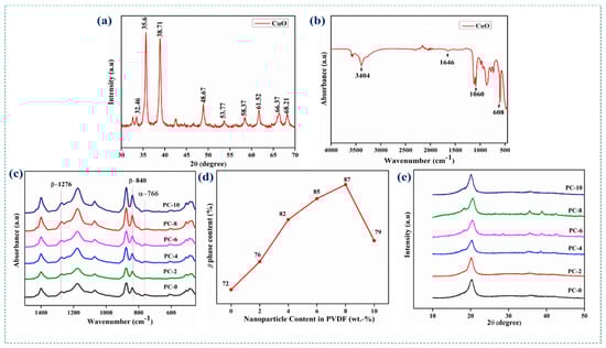 (a) XRD pattern and (b) FTIR spectrum of CuO NPs; (c) FTIR spectra and (d) quantitative graph of β-phase content (%); (e) XRD pattern of electrospun neat PVDF and 2, 4, 6, 8, and 10 wt.-% CuO NP-doped PVDF.
