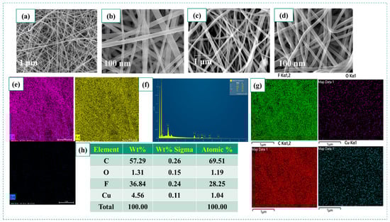 Figure 3 shows the surface morphology and elemental analysis of the electrospun PVDF and CuO-NP-doped PVDF fiber using FE-SEM and EDS. Figure 3a,b shows the surface morphology of the neat fiber. Figure 3c,d shows the surface morphology of the PC–8 fibers. Figure 3e shows the EDS analysis of neat PVDF (PC–0). Figure 3f,g shows the EDS mapping and elemental analysis of 8 wt.-% CuO-doped PVDF fiber. PC–8 showed better polar phase properties compared to the other compositions. Therefore, surface analysis was carried out for the optimized PC–8 sample. The fiber structures showed better structural stability, and the PC–0 fiber diameter was 38–110 nm. The average diameter of the doped fiber ranged from 250 to 300 nm. All fibers were arranged randomly. The EDS elemental analysis confirmed the successful doping of CuO NPs into PVDF.