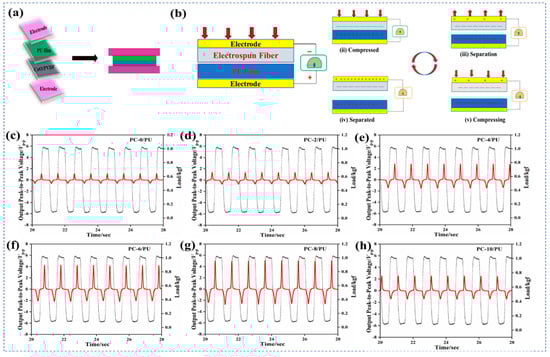 (a) Graphical view of the TENG device; (b) diagram illustrating the charge generating process of the PVDF–CuO TENG; (c–h) Peak-to-peak output voltage of the neat PVDF and PVDF–CuO (2, 4, 6, 8, and 10 wt.-%)/PU TENGs.