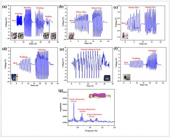 (a) Wearable applications of PC–8/PU TENGs sensing performance while tapping, bending, twisting, and rolling; (b) sensing performance of elbow movements; (c) theft monitor sensor; (d) sensor performance for leg movements; (e) applications for health care in smart chairs; (f) motion detection when sensor was connected to a shoe; (g) respiration and heartbeat monitoring of the human when the sensor is placed near to the chest during prone position.