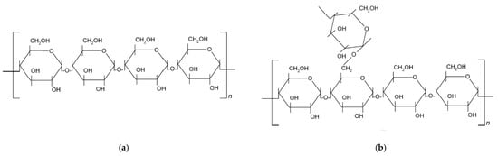 Starch is a very important and widely distributed natural product, occurring in the leaves of green plants, seeds, fruits, stems, roots, and tubers. Chemically, starch is composed of two kinds of polysaccharides, amylose (semicrystalline biopolymer soluble in hot water) and amylopectin (highly crystalline, insoluble in hot water) consisting of a large number of glucose units joined by glycosidic bonds (Figure 1). Amylose has a linear structure that provides the crystalline structure of the starch, and amylopectin, has a branched structure that presents the amorphous phase of the starch [20,21,22]. Depending on the source, starch generally contains amylose and amylopectin in a ratio of 15/85% to 30/70%. In both components, there are primary and secondary hydroxyl groups in every glucose unit, with different reactivity [20,23].
