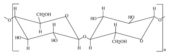 Cellulose is a polysaccharide whose molecule consists of a linear series of units of β-D-glucose residues connected by strong covalent glucosidic bonds between the first and fourth C-atoms (1–4 bonds). Every other anhydroglucose β-D-glucose residue in the molecule is rotated by 180° with respect to the previous one. Such a syndiotactic arrangement contributes to the fact that the three active hydroxyl groups of one anhydroglucose residue, one primary alcoholic and two secondaries, are always in the opposite position in relation to the polymeric chain (Figure 2). In addition, the structure of the macromolecule is represented by the repetition of cellobiose [25,26,27], where the rings are slightly bent in the shape of a saddle, respectively a saddle conformation.