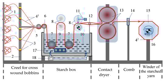 Every innovation in the starching process of spun yarns, which brings a new approach, new methods or optimizes the existing ones, represents a contribution to the production of woven fabrics. The aim of starching is to improve the properties of the yarn before the weaving process, if the yarn does not have satisfactory strength, sufficient resistance to wear and generates static electricity during the processing. The fibre and yarn processing stages before the starching process, as well as the processes that follow starching, affect the final quality and economic justification of starching. The properties of most spun yarns are not at a level that would meet the target quality and optimal woven fabric production. In order to realize the weaving process with a satisfactory utilization of the weaving machines and a satisfactory quality of the produced fabric, the warp and weft yarns must have certain properties that ensure the set goals [1,2]. Starching makes it possible to achieve the necessary properties that guarantee the target quality of the finished product. The efficiency of starching depends not only on the adhesion between the applied starching agent and the yarn but also on the ability to form a surface layer of starch pick-up, the rheological properties of the starch mass, the physico-chemical properties of the yarn, as well as on the technological parameters of the starching process itself [3,4].