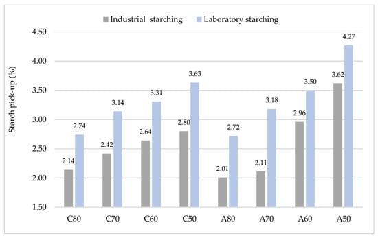 As it has already been pointed out, weaving preparation is an important process in the production of woven fabric that requires the yarn to starch before weaving for extra strength and abrasion resistance. During starching, a thin layer is formed (starch pick-up) on the surface to increase the strength of yarn and abrasion resistance whit reducing the yarn hairiness. Analyses have shown (Figure 5) that higher amounts of starch pick-up are retained on coarser yarns. By increasing the yarn fineness, the amount of starch pick-up decreases. In general, larger amounts of starch pick-up were achieved during laboratory starching.