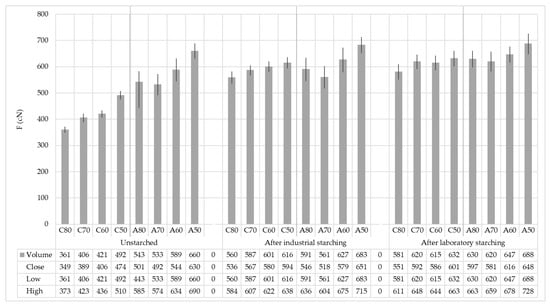 Figure 6 gives a clear overview of the yarn breaking forces before and after industrial and laboratory starching by samples, and the error intervals. Yarn fineness affected breaking forces and starching efficiency. Observing the overall results, it can be concluded that the coarser the yarn, the higher the breaking forces before and after starching. By starching, the finer yarn gained more breaking forces.