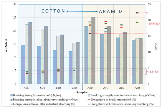 The yarns breaking elongation property was not significantly reduced by the starching process, especially during the laboratory starching of aramid yarns, which have a much wider range of value dispersion (15.8–22.4%) than cotton yarns (3.3–4.7%). For all starched yarn samples, the breaking strength also shows an increase. The maximum increase was achieved with cotton yarns (55.12%/C80), while aramid yarns achieve a significantly lower maximum value (8.84%/A80).