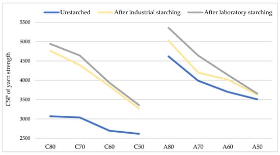 By laboratory starching, the yarn gained more breaking forces and strength than by industrial starching. The shorter path of the starching process on a laboratory device (1:5), i.e., the shorter path of the wet yarn (when it is the most sensitive) did not experience stretching as in an industrial plant. The lower speed of the starching process (3 m/min in laboratory starching: 60 m/min in industrial starching) influenced more efficient laboratory starching in all cotton and aramid yarn samples.