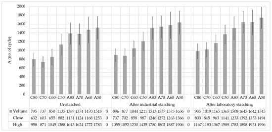 The yarn abrasion resistance also increased by starching (Table 6). Industrial starching resulted in a smaller increase of abrasion resistance, from 43 cycles or 4.12% (C60) to 101 cycles or 11.27% (C70) for cotton yarns, while for aramid yarns it ranges from 88 cycles or 5.48% (A50) to 145 cycles or 9.46% (A80). Laboratory starching resulted, as with the breaking forces, in a greater increase in cotton yarn abrasion resistance, from 154 cycles or 17.28% (C80) to 230 cycles or 16.85% (C50), while for aramid yarns, it ranges from 121 cycles or 8.02% (A80) to 271 cycles or 16.47% (A70).