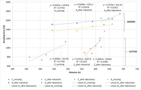 The relationship between the yarn breaking forces before and after industrial and laboratory starching and the abrasion resistance is shown by regression lines with associated equations and correlation coefficients (Figure 10). According to the obtained analysis, it can be determined that cotton and aramid yarns have a relatively high degree of correlation between the breaking force values and abrasion resistance. Unstarched cotton yarns have a correlation coefficient of R2 = 0.7746, yarns starched by an industrial process have R2 = 0.7237, and yarns starched by a laboratory process have R2 = 0.5498. Unstarched aramid yarns have a correlation coefficient R2 = 0.7755, yarns starched by an industrial process R2 = 0.9316, and yarns starched by a laboratory process R2 = 0.5351. Laboratory starching of cotton and aramid yarns has lower correlation values of breaking forces and abrasion due to the influence of greater variations caused by time and length shorter starching process in laboratory conditions.