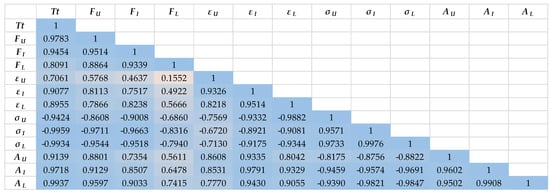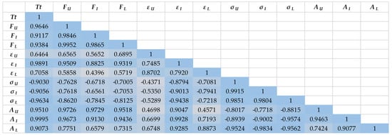 Furthermore, the parameters of both groups of tested yarns, measured after the implementation of the laboratory starching process, show a weaker mutual dependence, which is also understandable considering the laboratory conditions during the process implementation, which nevertheless affect the entire process differently than during the implementation of the industrial process. Thus, in the case of cotton yarns, the breaking force parameters of laboratory starched yarns correlate the weakest with all other tested parameters, as well as parameters of the elongation at break of non-starched yarns. In the case of aramid yarns, the breaking force parameters of laboratory and then industrially starched yarns have the weakest correlation with all other tested parameters, as well as the elongation at break of unstarched and laboratory starched yarns.