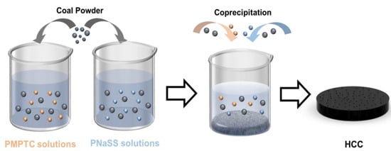 Fabrication of HCC: To prepare the HCC (as shown in Figure 1), a certain amount of coal (10 g) particles were put into a planetary ball mill (12LF-P12L, Hunan Focuses Experimental Instrument Co., Ltd., Hunan, China) and ground (with a rotating speed of 500 rpm) for 5 h to produce uniform coal powders (CPs). Next, PNaSS and PMPTC were dissolved separately in deionized water (90 mL) and magnetically stirred for 2 h at a speed of 500 rpm. Then, CPs (0.9 g) was added into PNaSS and PMPTC solutions, respectively. The mixtures were stirred vigorously for 1 h at a predetermined speed (1000 rpm) to ensure complete dispersion of CPs in the polymer solutions. Finally, the mixed solution of CPs and polyelectrolyte was slowly dropped into deionized water (50 mL) under stirring (500 rpm) for 30 min. Afterward, the mixture was left for 8 h for the self-assembly of HCC. The molar concentration ratio of polyanion (PNaSS)-to-polycation (PMPTC) was controlled at 1:1, 1.05:1, 1.1:1, 1.15:1, and 1.2:1 to prepare HCC of different charge ratios. The resulting HCC was dialyzed in deionized water for 3 days, with the water being changed every day. The samples were labeled as HCC-x, where x represented the molar ratio of PNaSS-to-PMPTC.
