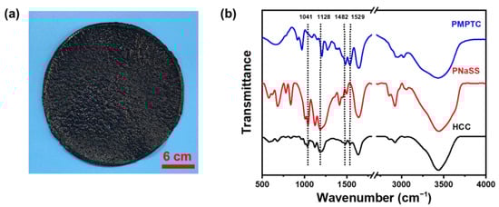 (a) Photograph of a typical HCC sample. (b) FTIR spectra of dried PMPTC, PNaSS, and HCC.