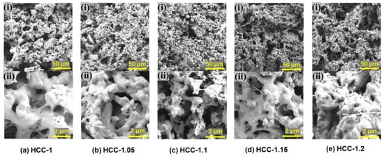 SEM photos of HCC: (a) HCC-1, (b) HCC-1.05, (c) HCC-1.1, (d) HCC-1.15, and (e) HCC-1.2.
