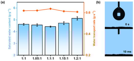 This varied porous structure induced by different charge ratios may alter the water absorbing ability, as well as the water transporting ability of HCC [32], which is crucial for solar-driven water evaporation. Figure 4a presents the statistical results of the saturated water content of HCC (analyzed through an ordinary one-way ANOVA, with Tukey’s correction for multiple comparisons between groups, the values are mean ± SD, n = 4, p < 0.05). Statistical differences were found for the saturated water content, indicating a charge-ratio-dependent water absorbing ability. As the charge ratio increased, the saturated water content exhibited a minimum at HCC-1.1 (4.42 ± 0.05 g g−1). This should be due to the fact that excess levels of either ionic polymer will bring extra water.