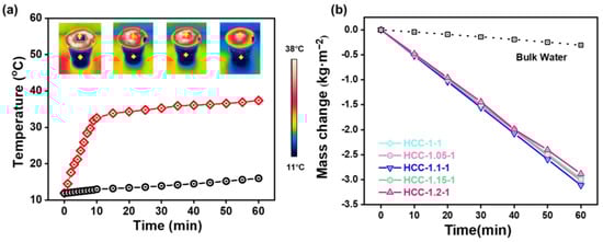 (a) Temperature evolutions of the HCC surface and bulk water. Insets show the infrared images of the temperature distributions at different time points. (b) Mass change in evaporated vapor of HCC in pure water over time.