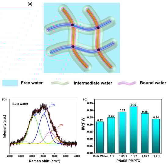(a) Schematic of the water in the hydratable polymer network of the HCC. (b) Raman spectra in the energy region of O–H stretching with fitting curves for bulk water. (c) The ratio of IW to FW of HCC with different charge ratios in pure water.