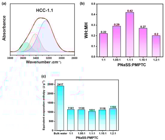 The charge-ratio-altered water states in HCC were further investigated using the FTIR method in the range of 3800–2800 cm−1. It has been documented that, in terms of pure water, there would appear two peaks for the hydrogen bonds (HB) at 3230 (strong HB, SH) and 3410 cm−1 (medium HB, MH) [35]. Figure 7a illustrates the typical FTIR spectrum of HCC-1.1; notably, a new peak at around 3583 cm−1 (weak HB, WH) appeared, as the bands in the range between 3800 and 2800 cm−1 could be well fitted with three Gaussian curves. The WH:MH ratio in HCC was further calculated and shown in Figure 7b; as the charge ratio came to 1.1:1 (charge balance point), the WH:MH came to a maximum (0.42), and a deviation from the charge balance point led to a decreased amount of activated water molecules. This trend is greatly consistent with the Raman results, as MH and WH correspond to the FW and IW inside HCC, respectively. The charge-ratio-altered water states in HCC could lead to varied energy being required for water evaporation, and thus improving its SVG performance. The equivalent evaporation enthalpy [36] of pure water in different HCC samples was then measured. As shown in Figure 7c, compared with bulk water, all the HCC samples exhibited remarkably lowered equivalent evaporation enthalpy of water, which reached a minimum of 1031 J g−1 for HCC-1.1, consistent with the Raman and FTIR results.