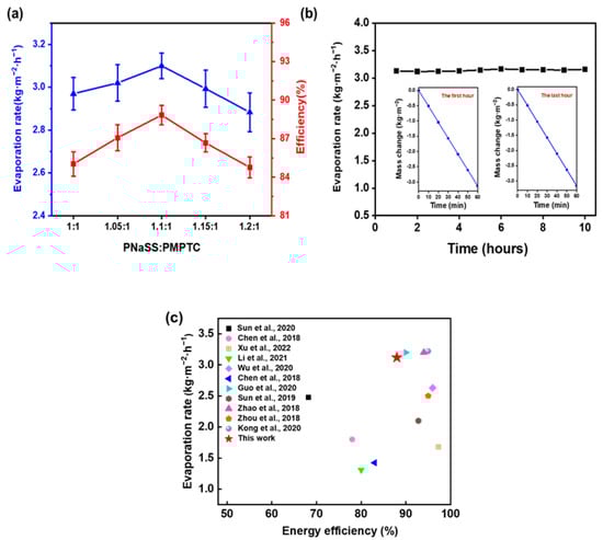 The energy conversion efficiency is an important parameter to access the SVG performance of HCC. As illustrated in Figure 8a, HCC-1.1 showed the fastest evaporation rate with a highest efficiency of 88.83%, consistent with the trend of the charge-ratio-dependent SVG. In the following, HCC-1.1 was selected for further SVG tests. To evaluate the stability of the SVG performance of HCC, a continuous 10 h evaporation test was performed. As shown in Figure 8b, the evaporation rate maintained stable in the range of 3.1 ± 0.1 kg m−2 h−1, indicating that HCC-1.1 has excellent evaporation stability and durability. Furthermore, the performance of the developed HCC was compared with previously reported materials in Figure 8c; HCC-based SVG achieved a competitively high evaporation rate and high energy utilization efficiency.