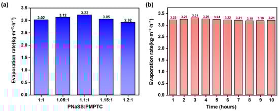 Next, the purification ability of HCC on simulated seawater was accessed. As shown in Figure 9a, the evaporation rate of HCC in simulated seawater (3.5 wt% NaCl solution) was slightly higher than that in pure water and, regardless of the charge ratio, a maximum evaporation rate of 3.22 kg m−2 h−1 appeared for HCC-1.1. This could be attributed to the unique interactions between the charged groups of PIC and salt ions and water molecules, which led to the improved hydration properties of the polymer networks, effectively activating the water molecules and reducing the energy required for evaporation [18]. Additionally, a continuous desalination test was performed on HCC-1.1. As shown in Figure 9b, the evaporation rate remained unchanged during the test, with no salt deposition on the surface, suggesting its reliability for seawater desalination.