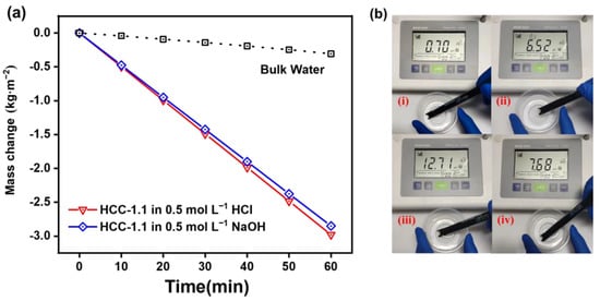 (a) Mass change in HCC-1.1 in 0.5 M HCl and NaOH (light intensity: 1 kW m−2). (b) pH value of the simulated wastewater of HCl (i) and NaOH (iii), and resultant purified water (ii) and (iv).