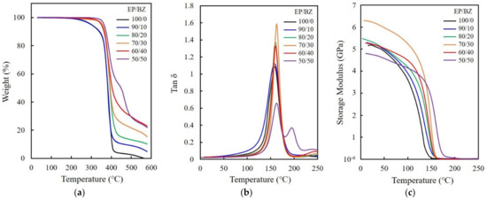 (a) TGA thermograms, (b) tan δ curves, (c) storage modulus curves of epoxy/benzoxazine mixtures obtained at various blending compositions.