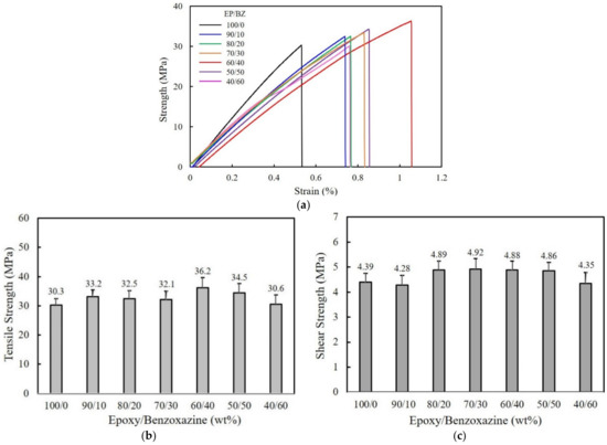 Comparison of (a) tensile strain–strength curve, (b) average tensile strength, and (c) average shear strength of epoxy/benzoxazine mixtures depending on blending compositions.