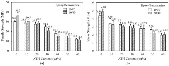 The variation of (a) tensile strength and (b) shear strength of pure epoxy and 60/40 epoxy/benzoxazine mixtures upon addition of ATH.