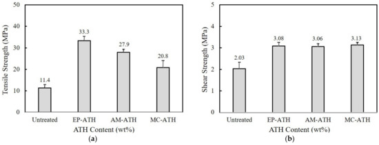 We find that the incorporation of ATH into the epoxy/benzoxazine mixture as well as pure epoxy leads to a substantial reduction in both tensile and shear strength. The ATH surface is modified using three different silane coupling agents containing epoxy (EP), amino (AM), and mercapto (MC) functional groups. Figure 6a shows the comparison of tensile strength of 60/40 epoxy/benzoxazine blends at 60 wt% ATH. All silane coupling agents exhibit remarkable increases compared to untreated ATH, in the order of EP-ATH > AM-ATH > MC-ATH. The tensile strength EP-ATH exhibits is 33.3 MPa, which is about three times higher than the value of the untreated ATH at the same composition. The MC-ATH also reveals a tensile strength value of 20.8 MPa, i.e., 9.4 MPa higher than that of untreated ATH.