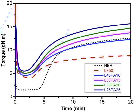 From the curing curves shown in Figure 1 and the parameters in Table 2, both of values minimum torque (ML) and maximum torque (MH) increased with the increase in PA content in the NBR/LF compound. It was found that the scorch time (ts2) decreased when LF and PA were introduced. This could be ascribed to the presence of reactive functional groups in both type of fibers that act as activators and accelerate the rate of the vulcanization, as pointed out in our previous work [27]. This observation was also similar to the report of T.D. Sreeja et al. [20] and Ismail et al. [28], where an increase in filler content resulted in a decrease in scorch time. Additionally, we found that the introduction of LF to NBR led to a decrease in the value of MH as the LF ratio increased. However, in the present study, we observed a different trend, where a higher PA content resulted in a higher MH value. This finding is noteworthy because it suggests that the presence of PA fibers could strongly enhance the total of crosslinking in the composite. Furthermore, the value of ΔM was also higher, indicating a higher crosslink density. The enhancement of crosslink density could be proved through the good interphase adhesion between NBR and PA (Supplementary Materials Figure S4).