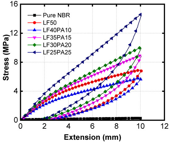 Hysteresis curve of NBR and samples with various LF/PA ratios.