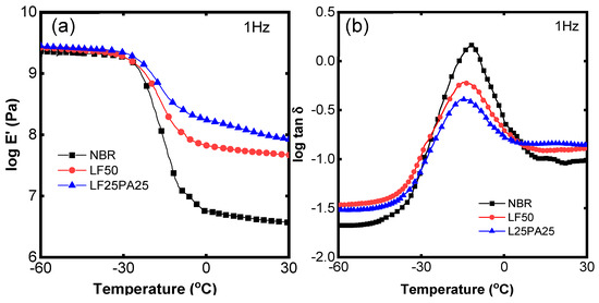 Figure 5 illustrates the dynamic mechanical properties of the samples. The storage modulus in the glassy region was slightly higher compared to that of NBR, LF50, and LF25PA25. However, in the rubbery region, the storage modulus was significantly improved in LF50 and LF25PA25 (Figure 5a). The storage modulus G’ in the rubbery region of LF25PA25 was found to have increased by 1.23 times compared to LF50, which was reasonable with data of the tensile strength. In addition, the tan δ values of the samples in Figure 5b decreased in the presence of LF and PA. The decrease in the tan δ peak occurred due to the fibers’ ability to restrict the mobility of polymeric chains. These results are consistent with another study [38]. Furthermore, the value of tan δ in the rubbery region also indicates that NBR/LF/PA exhibited higher energy dissipation compared to NBR and NBR/LF.