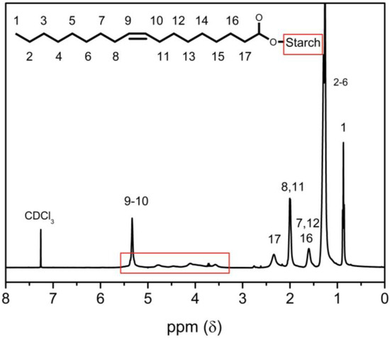 1H-NMR spectra were recorded in ppm relative to the solvent peak (chloroform-d6, 7.14 ppm) on a Varian 400 MHz spectrometer. The degree of substitution (DS) of starch hydroxyl groups was calculated using Equation (1) [18].