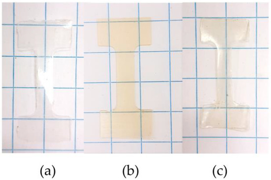Differences in appearance after curing of the films (~100 μm thickness) with (a) CPI for 2 h, (b) NPI for 2 h, and (c) HC for 4 h.