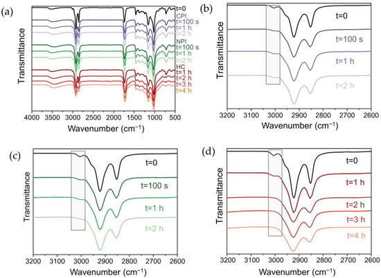 (a) Full normalized FTIR spectra for all films; (b–d) show the decreasing band corresponding to the C-H stretching of the C=C band of the oleate chain upon crosslinking for CPI, NPI, and HC, respectively.