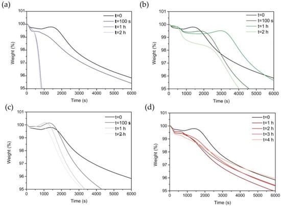Isothermal gravimetric analysis was performed at a constant temperature (150 °C): (a) films with CPI and (b) NPI after UV irradiation, (c) control films irradiated with UV in the absence of a photoinitiator, and (d) HC films.