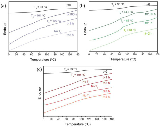 The films cast with NPI (Figure 5b) show a visible Tg for all curing times. The Tg is still visible because the crosslink density is lower compared to films cast with the CPI, as already shown by the gel content measurements and isothermal gravimetric analytical data. The Tg decreased slightly compared to the non-crosslinked starch oleate film, possibly due to the NPI acting as a plasticizer at low crosslink densities [38].