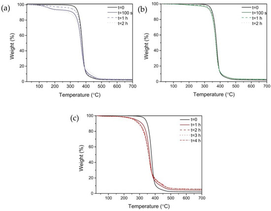 The TGA results also show a loss of 5–10 wt% at approximately 200 °C. The presence of the CPI can accelerate side reactions, e.g., chain scissioning, during UVC. Moreover, many side products are formed, e.g., hexanal, which has a boiling point of 129.6 °C [29,41].