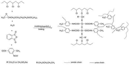 The preparation of rigid cross-linked PVC foams involves a reaction between KH-561, PVC, isocyanate, anhydride, and water. Due to the FTIR and EDS analysis of the KH-561 cross-linked and modified PVC foam sample with regard to the rigid cross-linked PVC foam materials comprising a semi interpenetrating network structure, a KH-561 grafted and cross-linked PVC chain was proposed, and it was found that excessive isocyanate reacted with hydrolyzed KH-561. The detailed reaction process is shown in Scheme 1. First of all, during the molding process, the blowing agent is thermally decomposed to generate a gas to form a bubble core. At the same time, KH-561 grafts onto the PVC molecular chains under the action of NaHSO3, and the isocyanate reacts with the acid anhydride to form an imide. During boiling, KH-561 is hydrolyzed and condensed to form a cross-linked structure. The isocyanate is then reacted with water to produce corresponding amines, while releasing CO2. Anhydride is hydrolyzed to produce corresponding acids. Excess isocyanate is reacted with acids and amines with high activity, forming amides and urea, respectively. Excessive NCO reacts with the Si–OH produced by the hydrolysis of KH-561 to form carbamate.