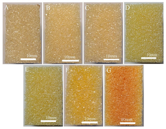 SEM micrographs (×30 magnification) of the molding blocks with different KH-561 and NaHSO3 contents. ((A): PKN0-0, (B): PKN3-1, (C): PKN6-2, (D): PKN6-0.6, (E): PKN6-0, (F): PKN9-3, (G): PKN12-4).