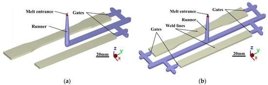 The tensile specimen was designed according to ASTM D638 Type I, as shown in Figure 1a. The total length of tensile specimen was 165 mm, with the gauge length of 50 mm. The flexural specimen (Figure 1b) was designed according to ASTM D790, with a span width of 51.2 mm. The injection runners of the specimens are exhibited in Figure 2. For the specimen without weld lines, there was only a gate at one end of the cavity for the melt to flow in, as shown in Figure 2a. For the specimen with weld lines, both ends of the cavity were equipped with gates, and the two streams of melt converged in the middle area of the specimen and formed the weld line, as shown in Figure 2b.