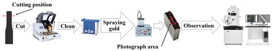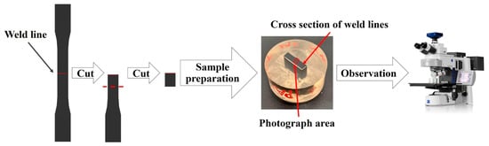 Fracture morphology was observed with the aid of scanning electron microscope (SEM) for the specimen after failure. The operation process is shown in Figure 3. The fiber orientation and distribution in the weld line regions were observed with ZEISS-Axio Imager M2m (Carl Zeiss Co., Ltd., Oberkohen, Germany) microscope, and the operation process is shown in Figure 4.