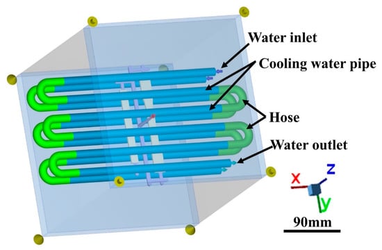The mold flow analysis software Moldex3D Studio 2021 (CoreTech System Co., Ltd., Suzhou, China) was used to simulate the injection molding process, including filling, packing, cooling, and other stages, to analyze the fiber orientation tensor distribution, melt meeting angle, etc. The design of the cooling water path of the model is shown in Figure 5.